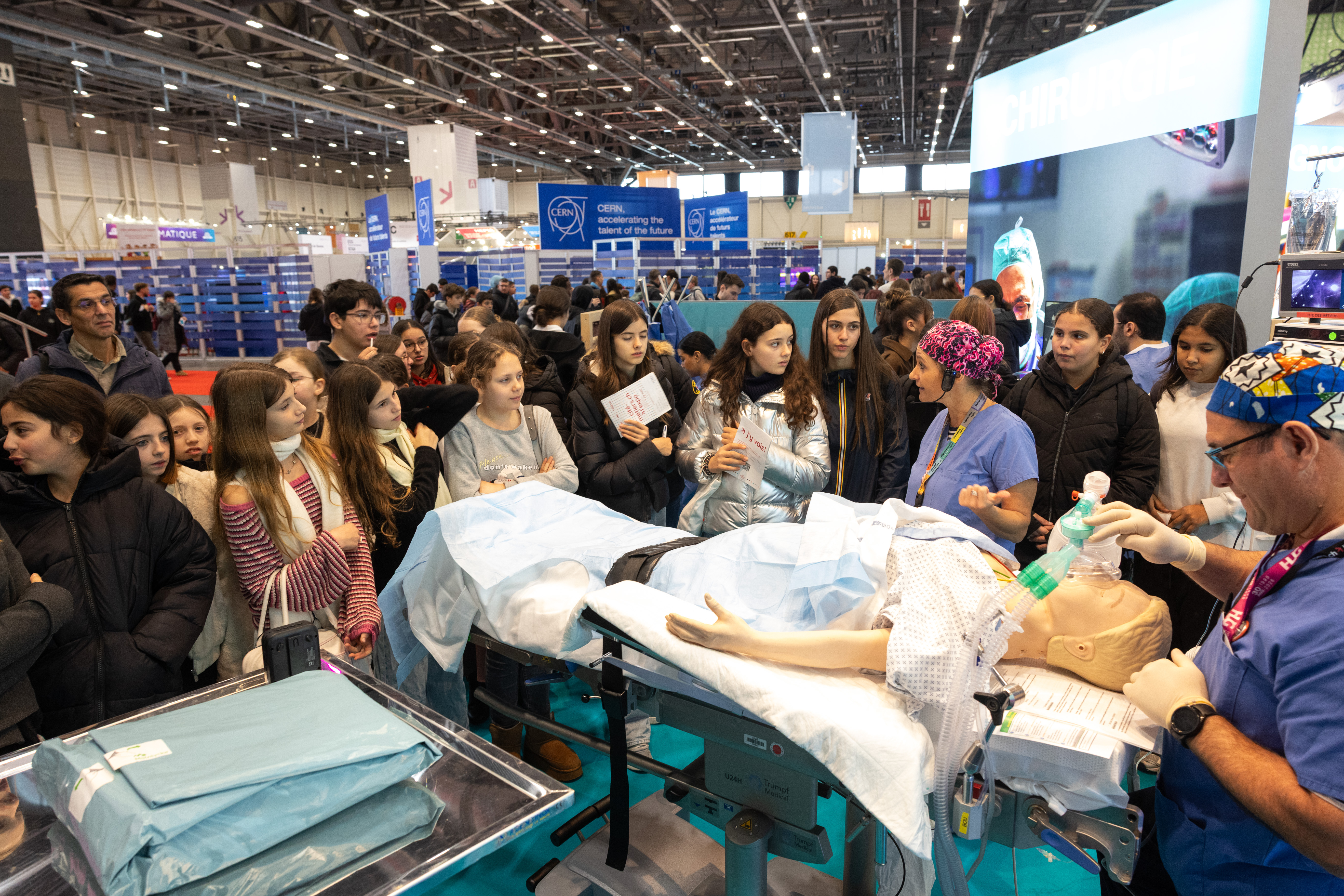 Le stand des HUG proposait un parcours immersif structuré autour de quatre grands univers représentatifs de l’activité hospitalière. Un premier espace, dédié à l’innovation, permettait de découvrir l’intelligence artificielle, la réalité virtuelle, la cybersécurité et le développement d’applications. La surface dédiée aux soins offrait quant à elle une initiation à différents gestes techniques, à l’ergothérapie, aux mesures d’hygiène et à la simulation de situations d’urgence. De son côté, l’univers de la chirurgie plongeait les visiteurs et visiteuses au cœur du bloc opératoire, entre robotique, sutures, anesthésie et échographie. Enfin, le diagnostic invitait à explorer la radiologie ainsi que le travail en laboratoire.