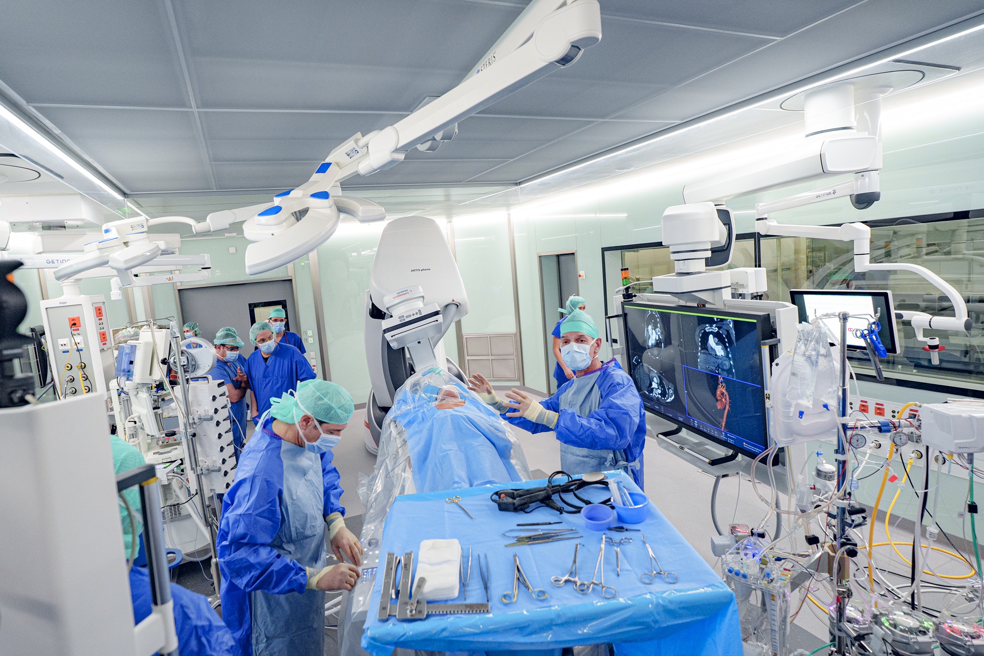 Les salles hybrides réunissent, dans un même lieu, des activités jusque-là séparées, notamment la chirurgie et la radiologie. Grâce à des systèmes d’imagerie en temps réel, en 2D et 3D de très haute définition, les équipes peuvent réaliser gestes chirurgicaux et images au même moment, sans attendre la fin de l’intervention .