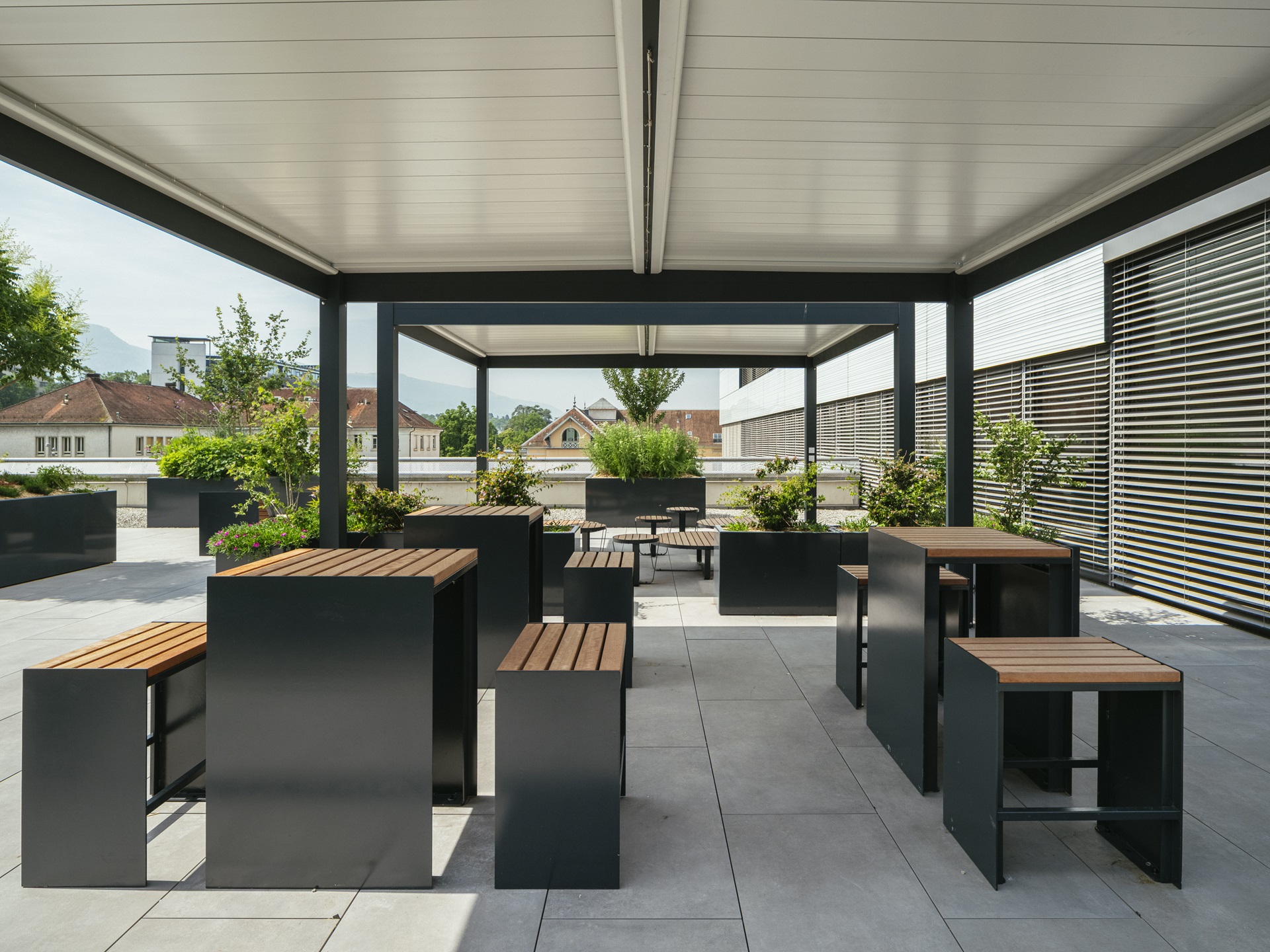 Cette transformation poursuit une série d’aménagements déjà engagés sur le site. Depuis 2023, des centaines de bacs ont fleuri dans différents espaces, notamment vers la rotonde, à l’entrée de la Maternité et sur la terrasse située en face de l’Espace médiation. Accessible depuis le couloir vitré reliant les bâtiments Julliard et Opéra, cette terrasse toiture, autrefois sous-exploitée, a été réaménagée avec deux pergolas bioclimatiques. Des plantations existantes ont été conservées et complétées, tandis que de nouveaux bacs et un mobilier varié créent des zones d’ombre et invitent à s’y arrêter. Un revêtement clair en grès cérame apporte plus de fraîcheur que l’ancien sol sombre.